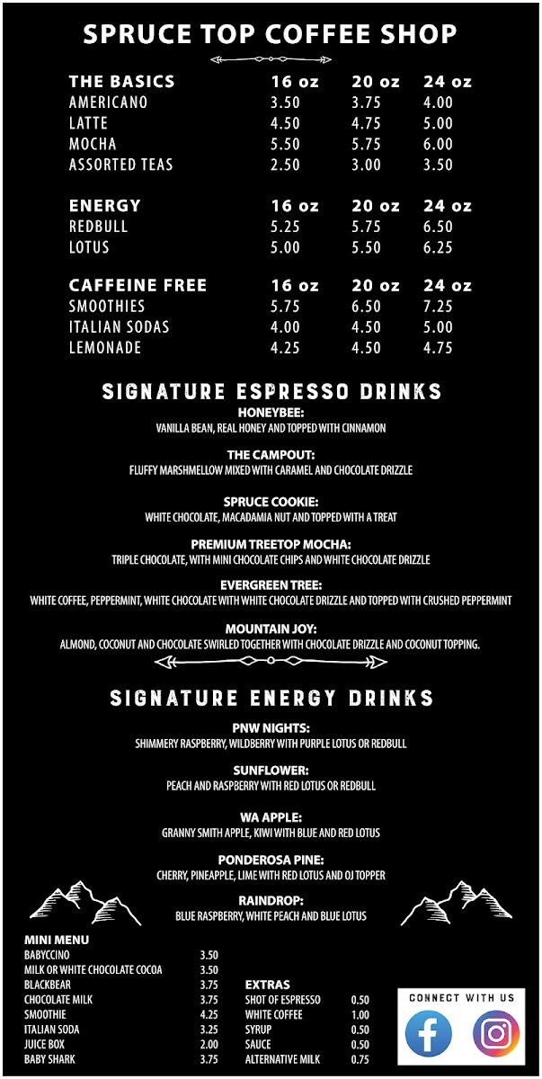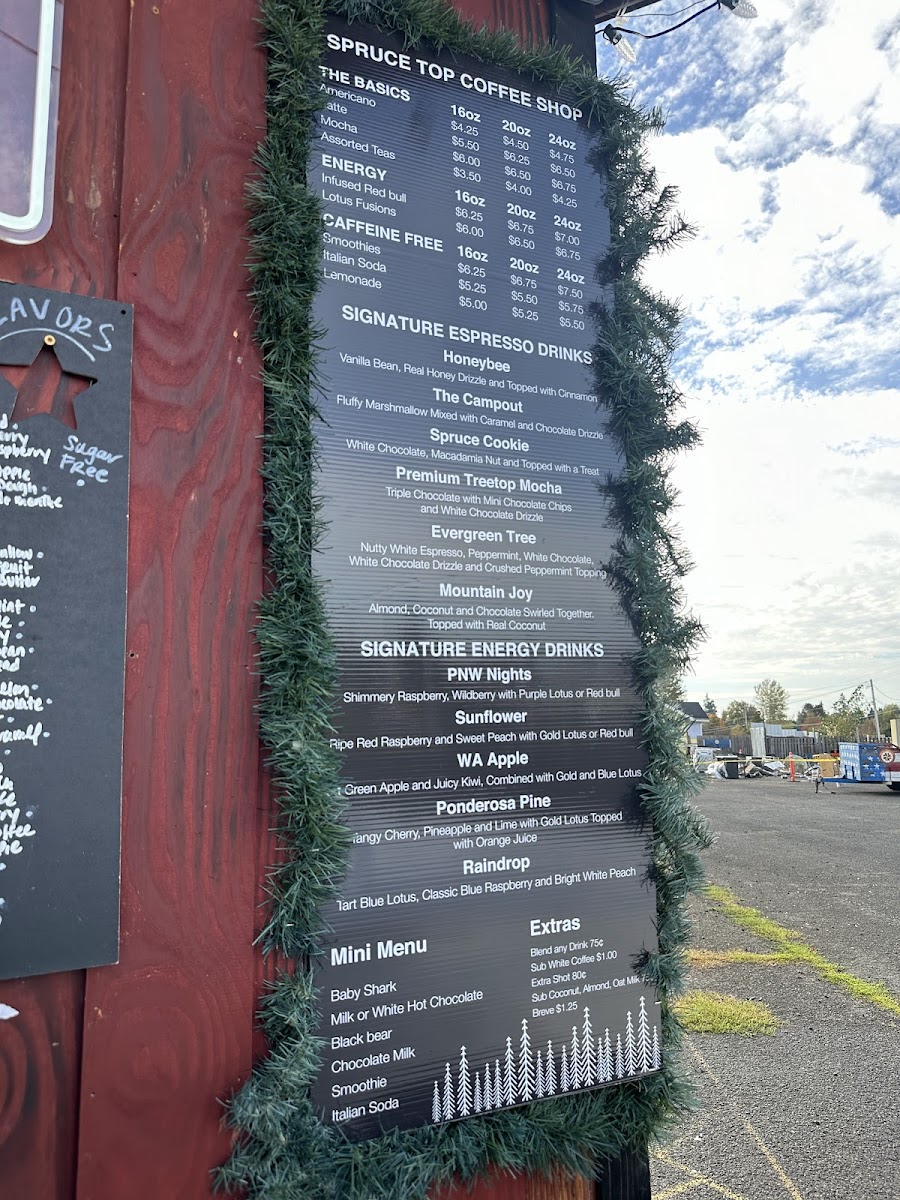 Welcome to Spruce Top Coffee Shop, a cozy café nestled in Battle Ground, WA, known for its delightful atmosphere and exceptional coffee offerings. With an eclectic menu featuring signature espresso drinks like the Honeybee, Premium Treetop Mocha, and Evergreen Tree, the café caters to diverse palates. Each drink, priced reasonably at around US$6.00 for mochas, is crafted with care, reflecting a passion for quality that owner Bianca embodies.